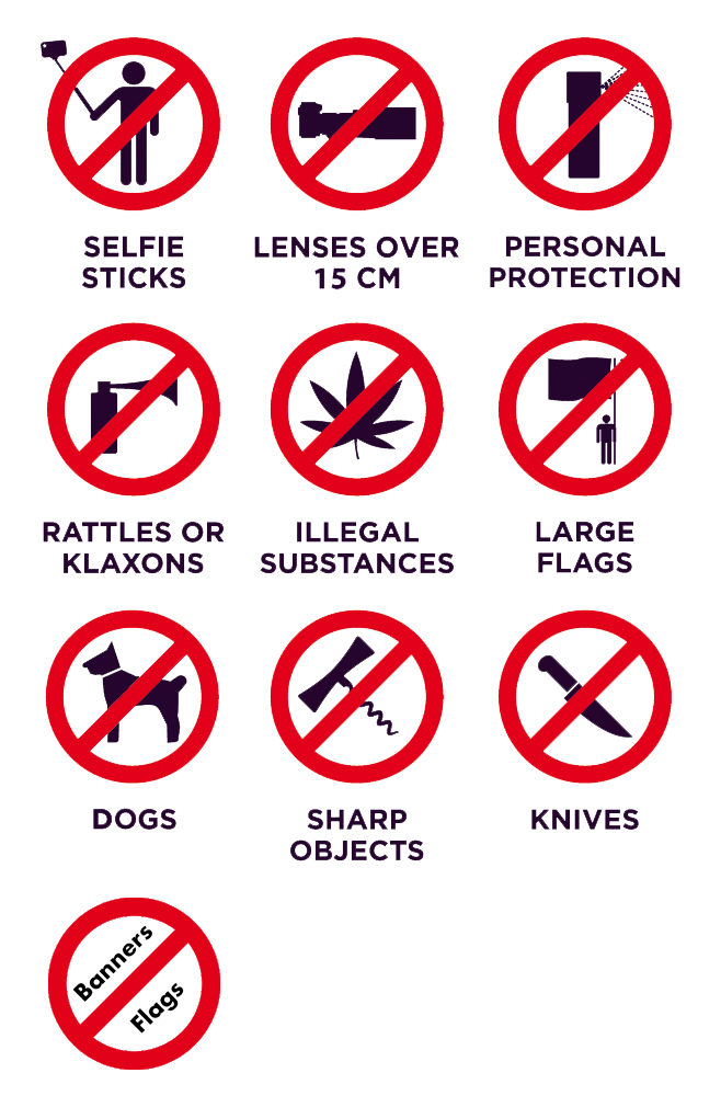 - Het is verboden om spandoeken, vlaggen en andere tekstdragers met kwetsende, discrimineerde en provocerende teksten of beelden mee te nemen. Het oordeel hierover ligt bij de beveiliging en de organisatie.